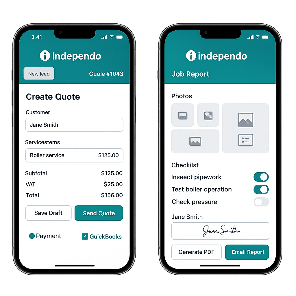 Independo is a simple CRM + app for small & self-employed businesses. Capture leads, send quotes, schedule jobs, invoice, chase payments, and market to customers—automatically.